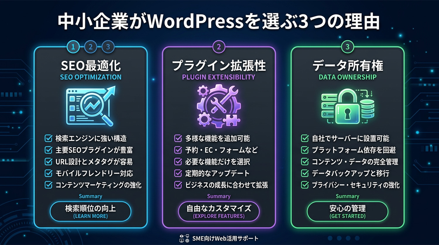 結論から言うと、集客・ビジネスの成長を目的とするなら、WordPressをおすすめします。その理由は主に3つあります。